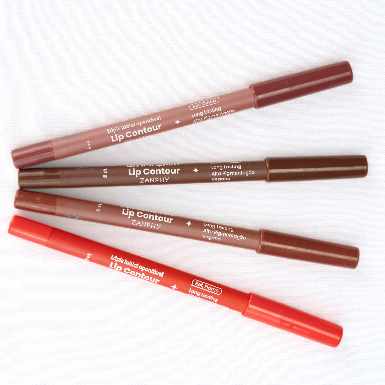 Contorno Labial Zanphy. Com uma fórmula cremosa que desliza suavemente, garantindo um contorno de lábios impecável por até 12 horas, com 4 cores. Uma vez seco, este produto se torna à prova d'água.