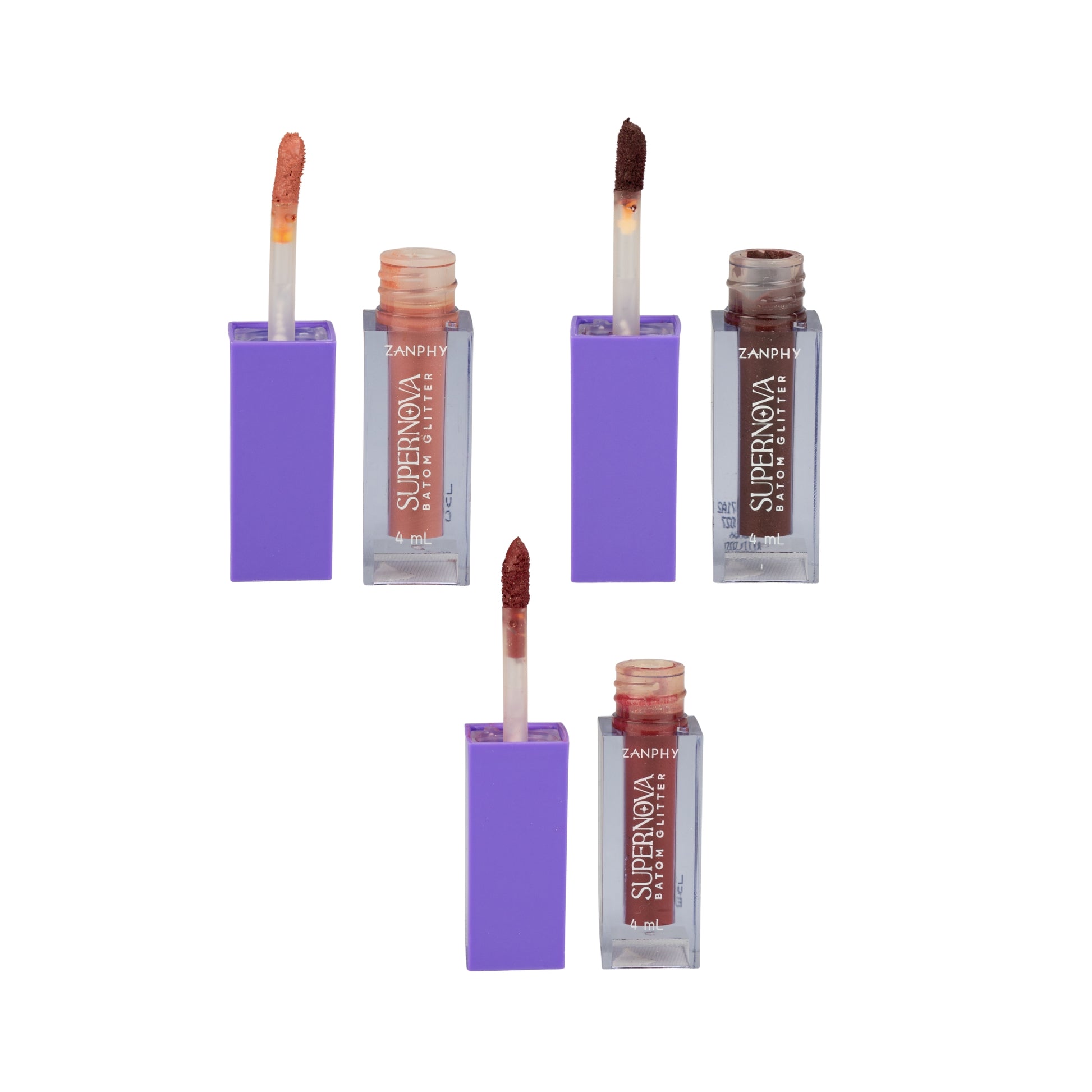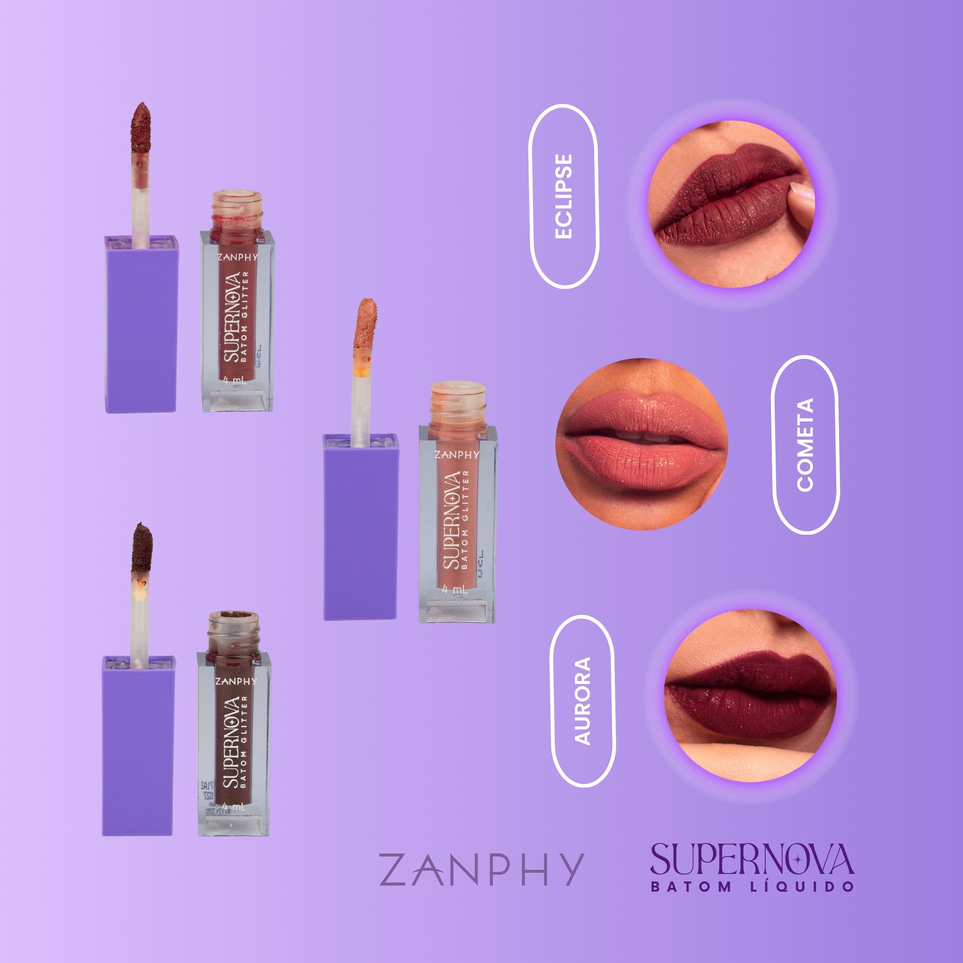 Leve 3 batons líquidos matte Supernova. Três cores icônicas para looks do básico ao impactante. Textura aveludada, acabamento matte confortável e o fenômeno de brilho que aparece quando você fricciona os lábios. A fórmula é Long Lasting, com Ácido Hialurônico para hidratação e Vitamina E antioxidante. Resultado: cor intensa, conforto o dia todo e um efeito luminoso único, sem abrir mão de ser vegano e cruelty-free.
